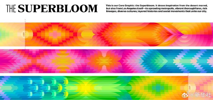 据介绍,“超级花海”是南加州难得一遇的自然景观:野花种子在合适的条件下同时绽放,从而使山坡、山谷与沙漠形成彩色波浪。洛杉矶奥组委品牌设计负责人表示,这恰如运动员们经过刻苦训练、在奥运舞台上迎来绽放的那一刻。