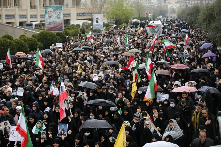 3月20日,在伊朗首都德黑兰,人们参加伊朗情报部长伊斯梅尔·哈提卜及其家人的遗体告别仪式。新华社发