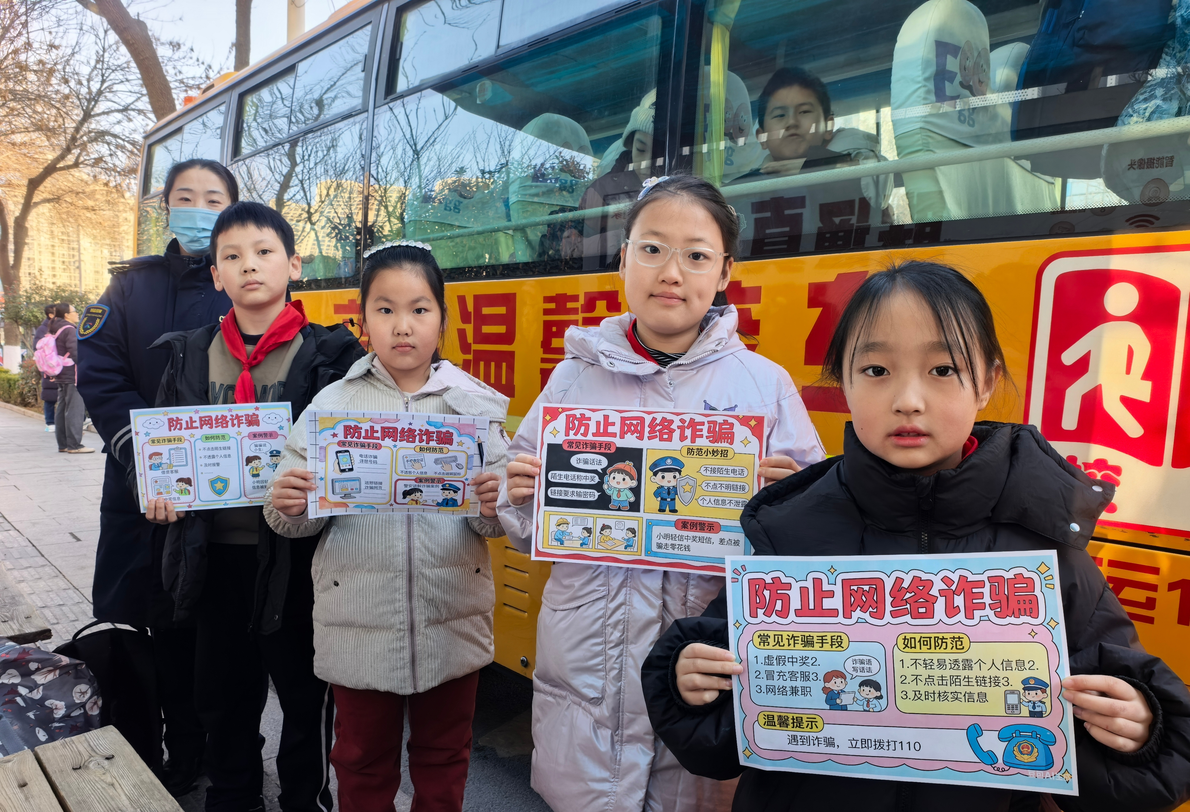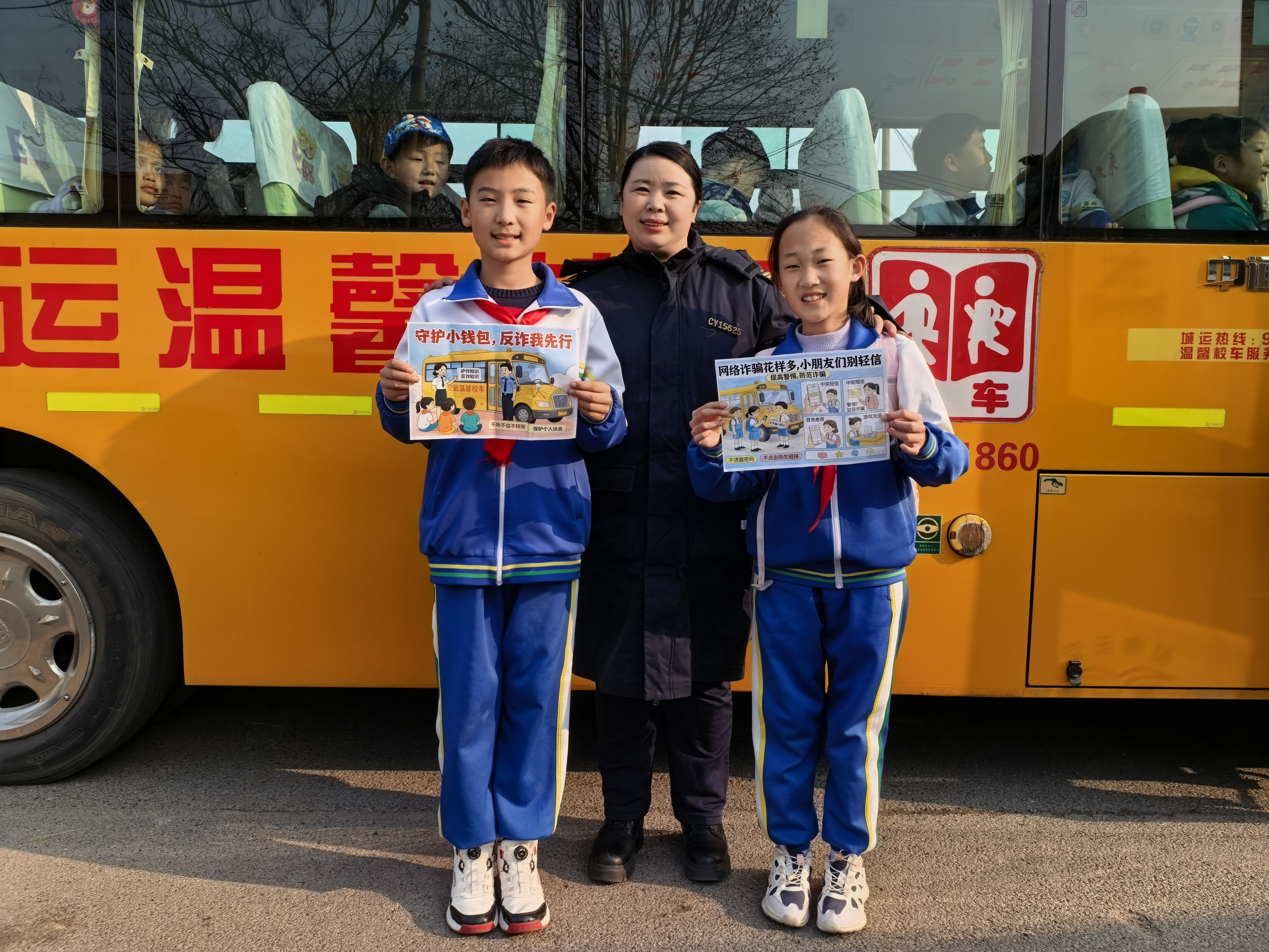 温馨校车育才分公司镇江路小学9号线随车照管员王倩结合校园常见场景,采用趣味问答的方式,将“陌生链接不点击、中奖红包不乱领、客服退款不轻信”等防骗知识,转化成孩子们听得懂、记得住的“安全口诀”,号召大家争当起家庭反诈的“小小宣传员”,用智慧守护自己的“小钱包”与幸福生活。