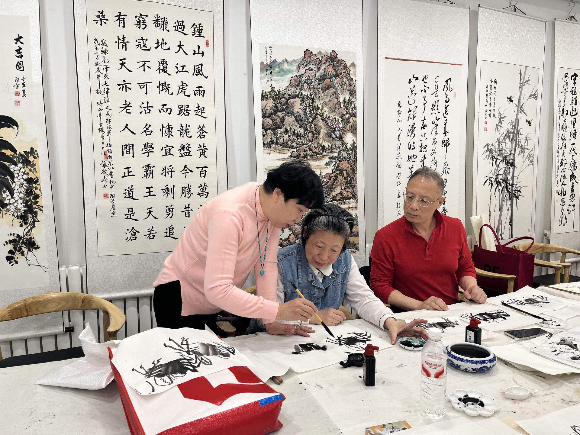 开课伊始,卜范勋老师并未急于让学员动笔,而是从国画的历史脉络与审美精神讲起,带领大家认识毛笔、宣纸、墨汁等工具的特性,并示范了正确的执笔姿势与基础笔法。在随后的实践环节中,学员们从基础笔法开始练习,从颤抖生涩的第一笔,到逐渐沉静下来的专注神情,不少学员虽是初次握笔,却在卜范勋老师的耐心指导下,成功画出了第一笔富有变化的线条。