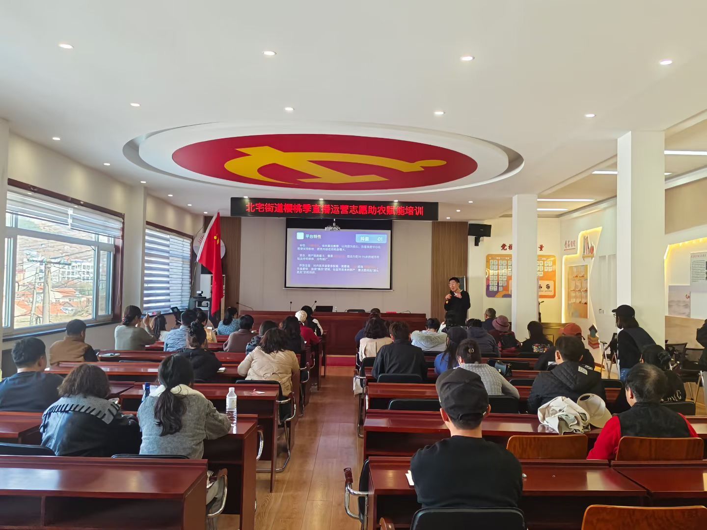 3月25日下午,“社工赋能助农 志愿聚力兴村”北宅街道社工站樱桃季直播运营志愿助农赋能培训在崂山举行。在两个半小时的课程中,专业讲师围绕极简直播间搭建、樱桃带货话术、小黄车挂载等实用主题展开讲解,并进行现场答疑。本次培训吸引了辖区樱桃种植农户、困难群众、村书记、新农人等数十人参与,为即将到来的樱桃季销售注入了强劲的“云动力”。
