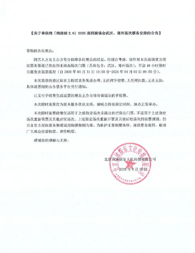 3月30日,单依纯本次巡演的主办方北京百沐娱乐文化传媒有限公司@百沐娱乐 发布公告:经综合考虑,针对@单依纯 「纯妹妹2.0」2026巡回演唱会官方授权票务渠道已售出但未演出场次门票(具体包含:武汉、郑州场次),开启48小时限时自愿免责退票流程(自2026年03月31日10:00—2026年04月02日09:59)。