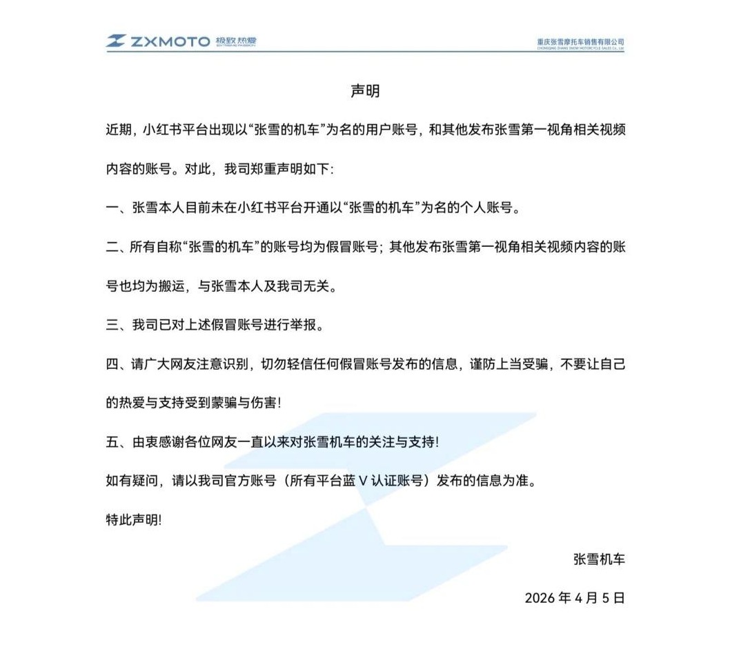张雪机车发布声明