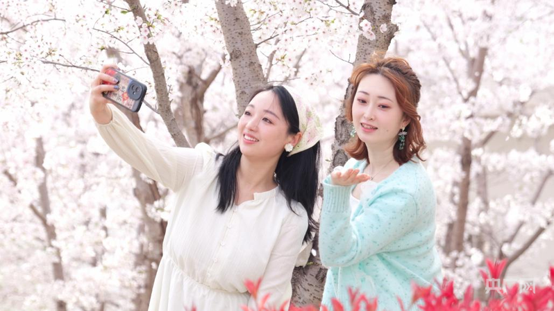 游客在樱花树下打卡拍照(央广网发 刘孟孟 摄)