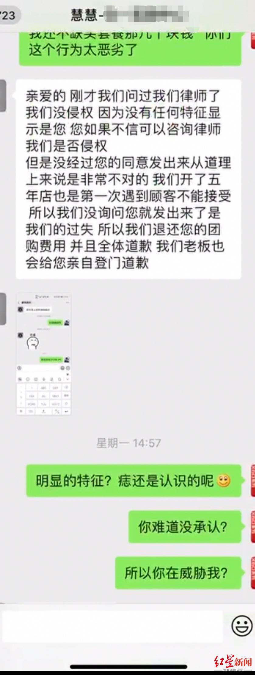 不过之后,慧慧又发来信息称咨询过律师,“我们没侵权,因为没有任何特征显示是您。”同时也表示:“没有经过您的同意就发出来从道理上来说是非常不对的,我们开了5年店也是第一次遇到顾客不能接受,所以我们没询问您就发出来了,是我们的过失。”