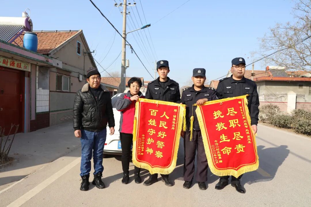 青岛日报社/观海新闻12月28日讯 12月24日上午,胶州市公安局铺集派出所巡逻队员来到牛沟二村看望庄先生一家,庄先生夫妻二人无法用言语表达感激之情,激动地拥抱着巡逻队员,流着眼泪表达着感激之情。同时,两人将一面印有“尽职尽责,挽回生命”的锦旗送到巡逻队员手中,再三感谢巡逻队员的及时敲门,才挽回了一家“顶梁柱”庄先生的生命。
