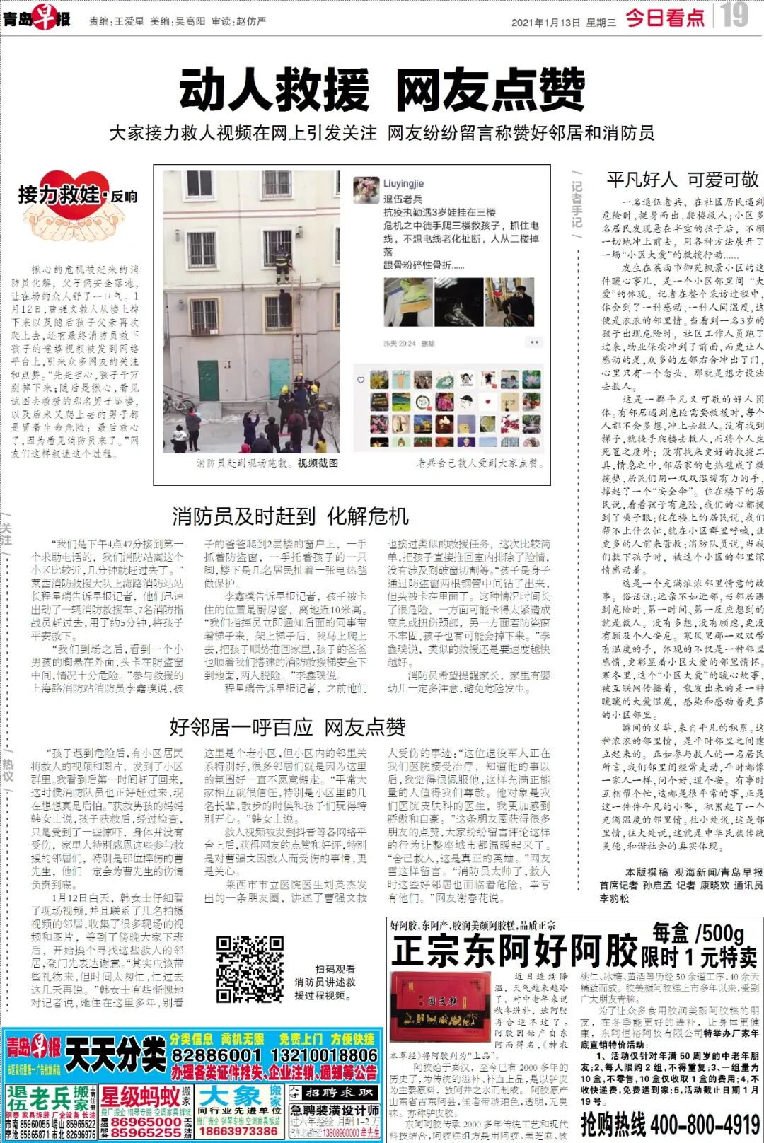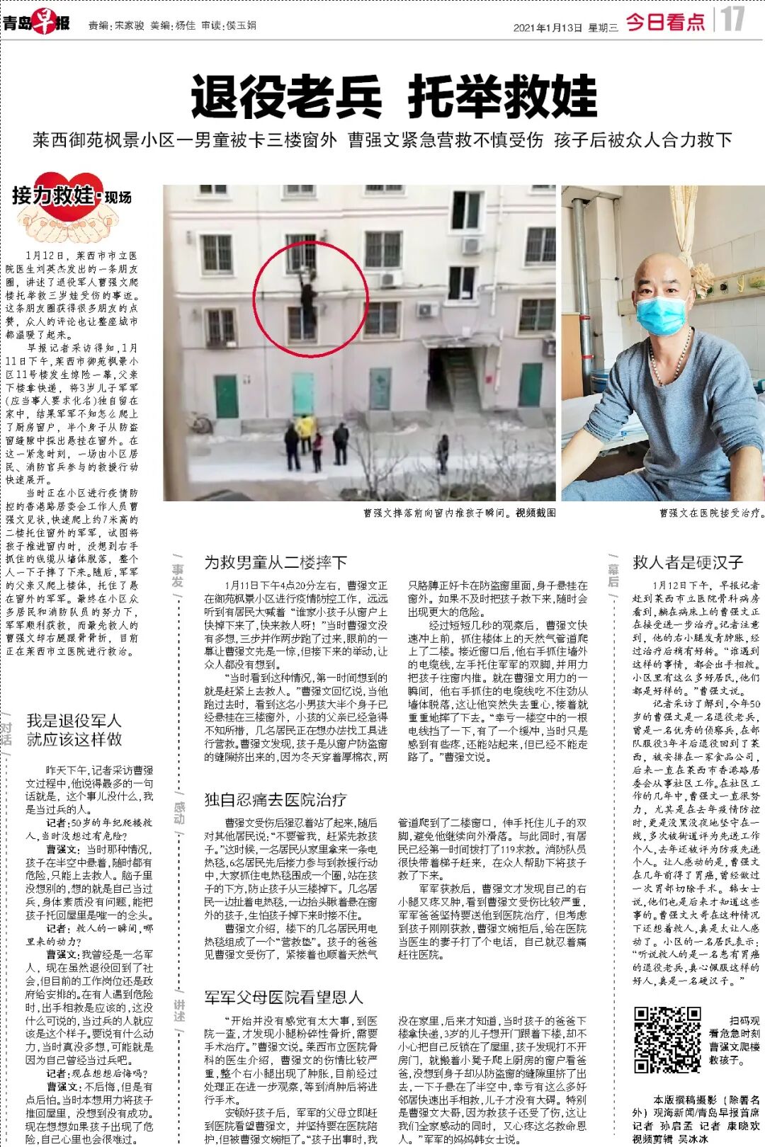 1月12日,莱西市市立医院医生刘英杰发出的一条朋友圈,讲述了退役军人曹强文爬楼托举救三岁娃受伤的事迹。这条朋友圈获得很多朋友的点赞,众人的评论也让整座城市都温暖了起来。