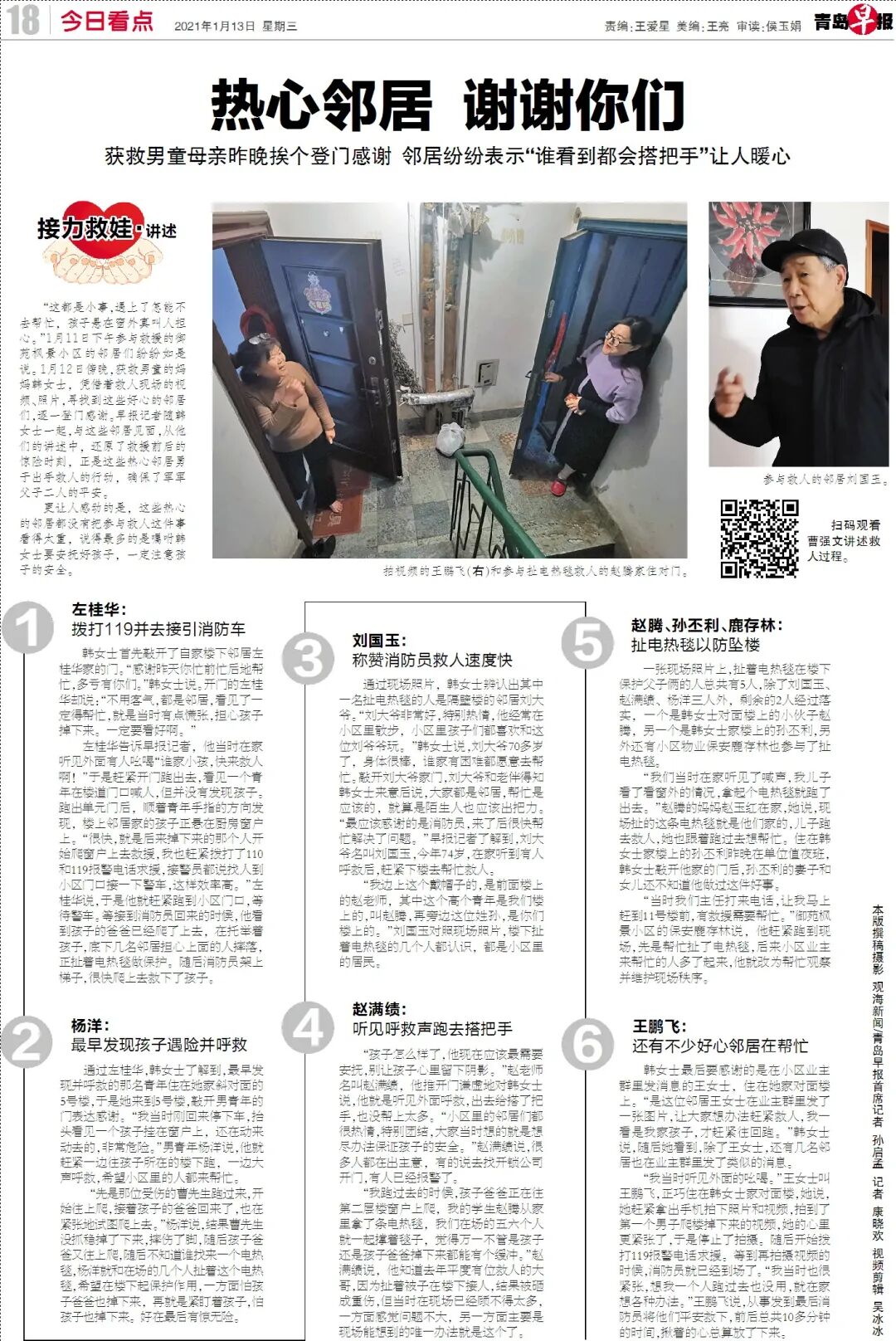 1月12日白天,韩女士仔细看了现场视频,并且联系了几名拍摄视频的邻居,收集了很多现场的视频和图片,等到了傍晚大家下班后,开始挨个寻找这些救人的邻居,登门先表达谢意。“其实应该带些礼物来,但时间太匆忙,忙过去这几天再说。”韩女士有些惭愧地对记者说,她住在这里多年,别看这里是个老小区,但小区内的邻里关系特别好,很多邻居们就是因为这里的氛围好一直不愿意搬走。“平常大家相互就很信任,特别是小区里的几名长辈,散步的时候和孩子们玩得特别开心。”韩女士说。