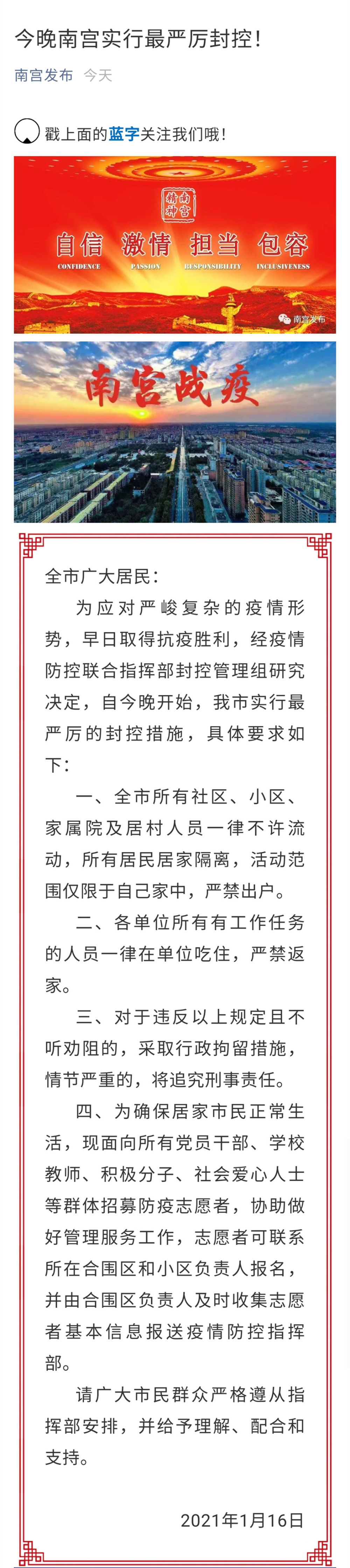 为应对严峻复杂的疫情形势,早日取得抗疫胜利,经疫情防控联合指挥部封控管理组研究决定,自今晚开始,我市(河北邢台南宫市)实行最严厉的封控措施,具体要求如下: