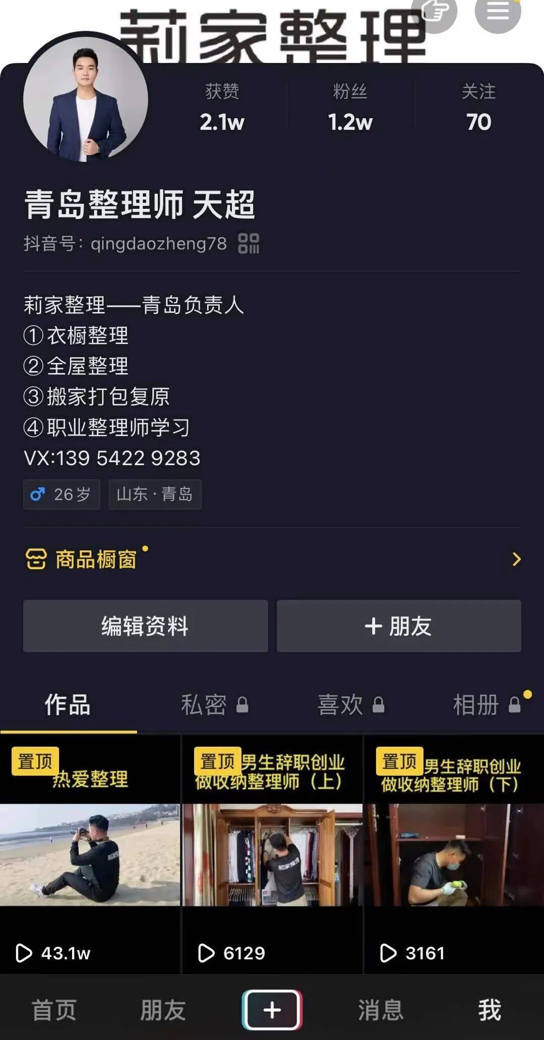 2019年8月份,偶然间刷短视频,孙天超第一次看到了整理师这个行业。看到视频里,整理师每天帮客户解决整理方面的难题,接受整理爱好者们的整理咨询,拥有着不菲的收入,他脑袋里瞬间闪过一个信念,“这就是我想做的,我要成为青岛第一个“95后”男整理师!”