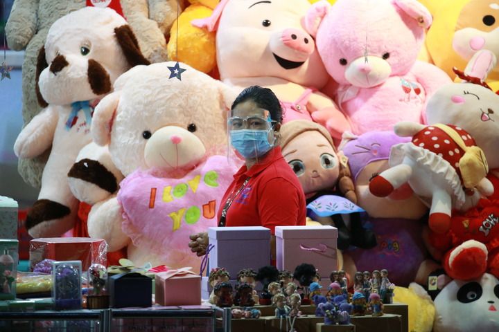 2月5日,店员在缅甸首都内比都一处超市内售卖玩偶。(新华社记者张东强摄)