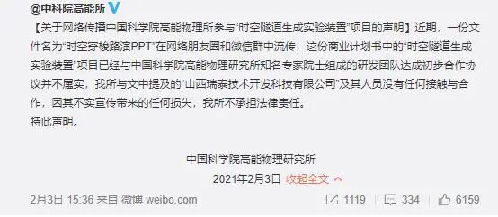 中科院表示,这份商业计划书中的“时空隧道生成实验装置”项目已经与中国科学院高能物理研究所知名专家院士组成的研发团队达成初步合作协议并不属实,我所与文中提及的“山西瑞泰技术开发科技有限公司”及其人员没有任何接触与合作,因其不实宣传带来的任何损失,我所不承担法律责任。