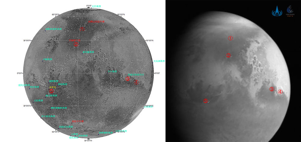 这是国家航天局公布的“天问一号”在距离火星约220万公里处获取的首幅火星图像及火星部分标志性地貌标示。新华社发(国家航天局提供)