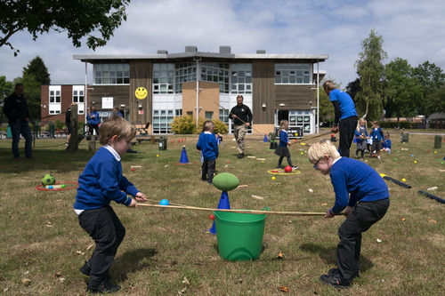6月8日,在英国斯塔福德郡,兰迪伍德小学学前班的学生们在培训老师的带领下用小棍子做保持安全距离相关游戏。新华社发
