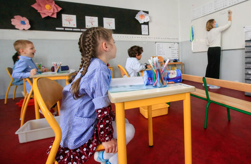 5月12日,在法国南部城市尼斯的西蒙娜·维伊小学,学生在教室内上课。新华社发