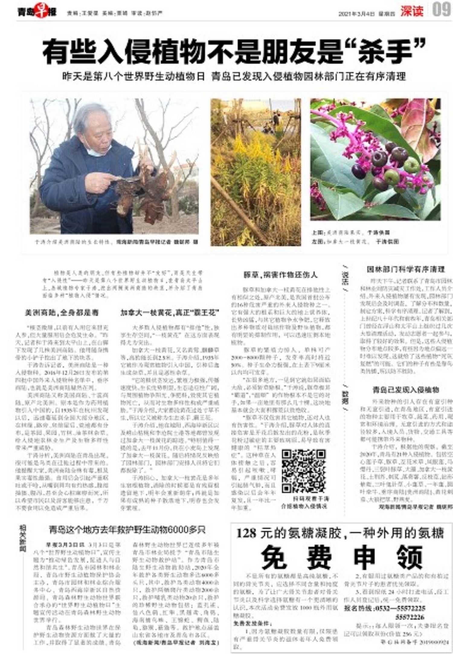 于涛介绍,根据他的观察,截至2020年,青岛有21种入侵植物。包括空心莲子草、豚草、互花米草、凤眼莲、马缨丹、三裂叶豚草、大薸、加拿大一枝黄花、土荆芥、刺苋、落葵薯、反枝苋、钻形紫菀、三叶鬼针草、小蓬草、一年蓬、圆叶牵牛、垂序商陆(美洲商陆)、黄花刺茄、大狼把草、野燕麦。(观海新闻/青岛早报记者 魏铌邦)