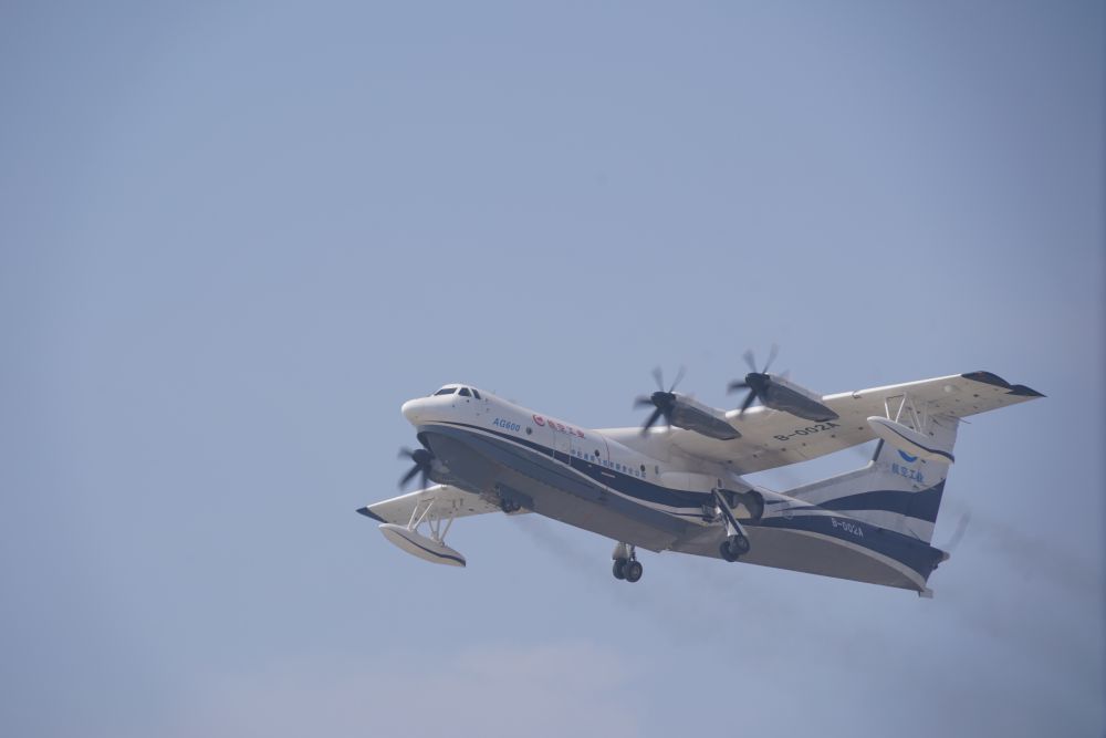 AG600飞机001架机于2016年完成总装;2017年12月24日在广东珠海金湾机场顺利完成陆上首飞;2018年10月20日,又在湖北荆门漳河机场完成了水上首飞。2020年7月26日,AG600飞机001架机在山东青岛团岛附近海域成功实现海上首飞,进一步验证了其海上相关性能,为其后续进行特定环境下的应急救援工作做好了准备。