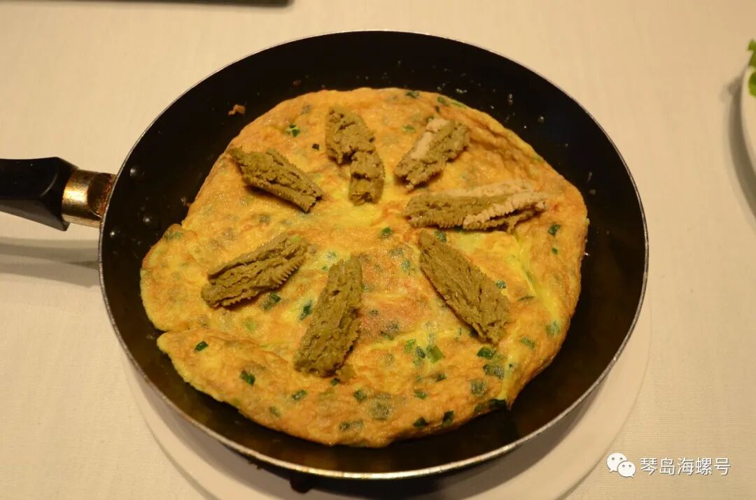 香椿焯水过凉切成碎末,活海星取出海星籽加鸡蛋、食盐和香椿末拌匀,用不粘锅烙熟即可。