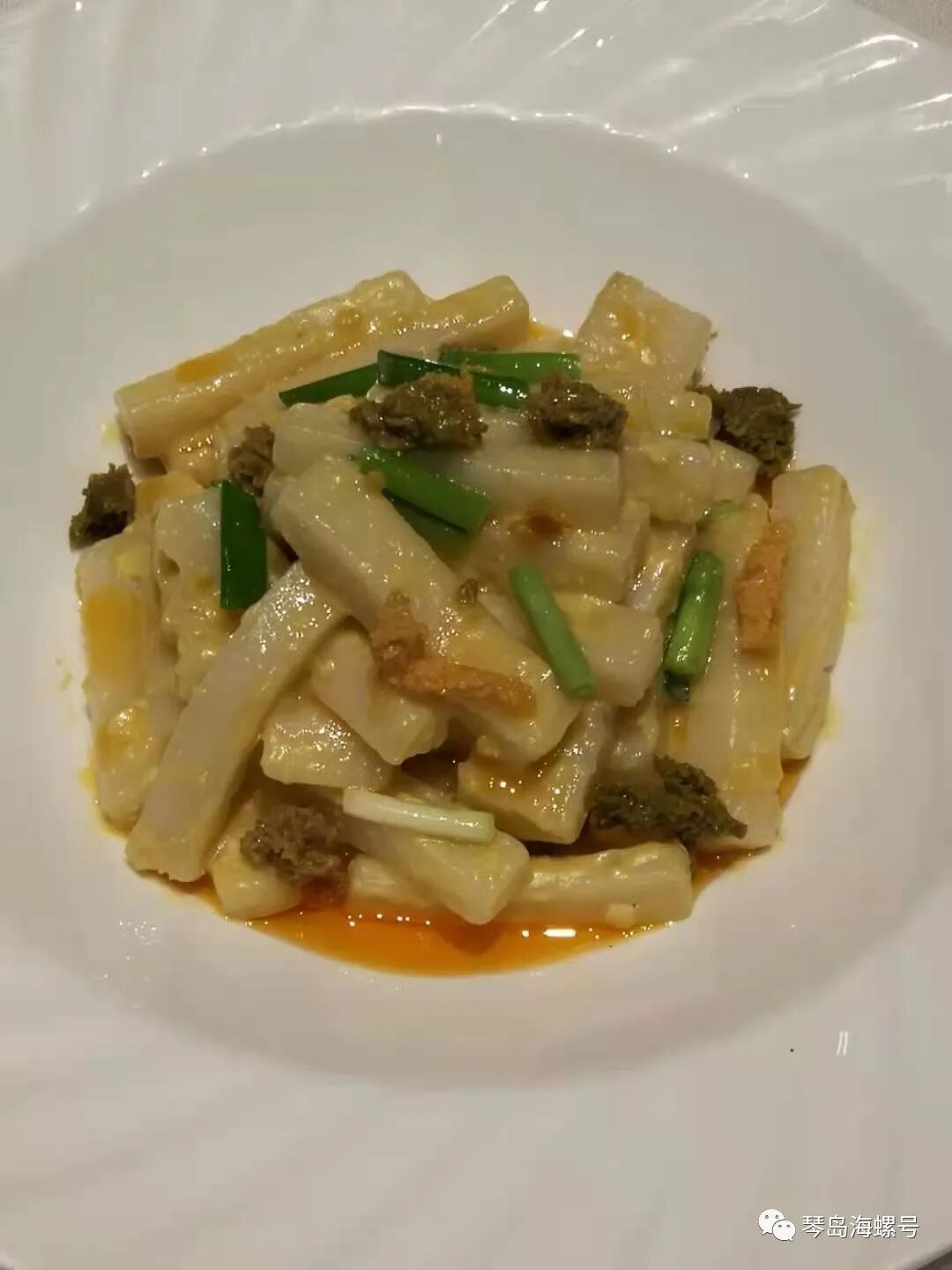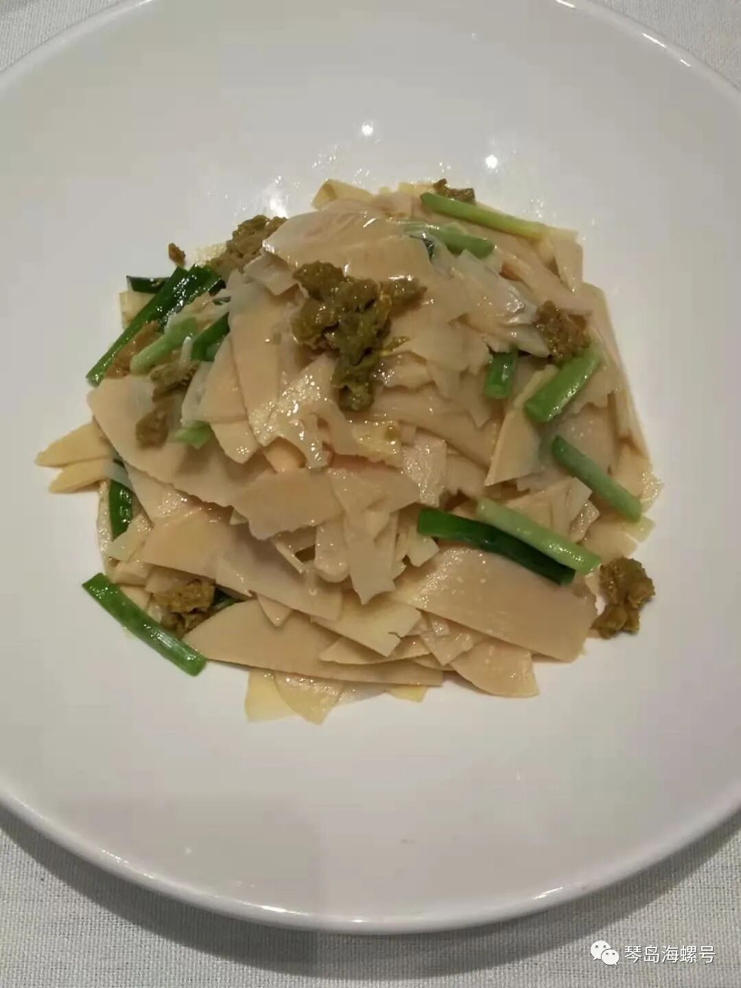 海星蒸熟取出海星籽,春笋切薄片焯水过凉,韭菜只要根部用开水燎一下。所有原材料加上食盐、花椒油、葱油拌匀即可。这道菜把春笋和海星结合起来,咸鲜口感,突出春天的气息。海星也可以和大田菠菜结合起来,用辣椒油炝拌,又是另外一种麻辣鲜香的味道。