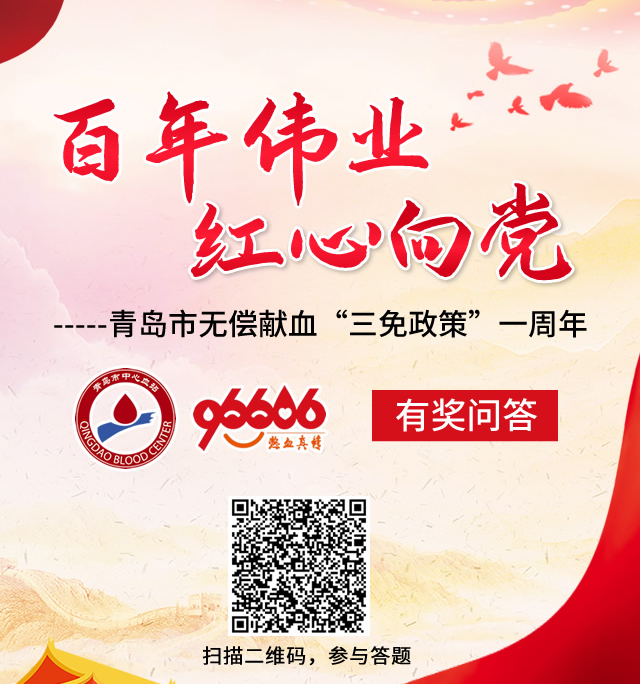 为了让更多的岛城爱心市民了解政策,享受政策,借着喜迎建党百年的东风,青岛市中心血站特推出了“百年伟业,红心向党——青岛市无偿献血‘三免政策’实施一周年有奖问答”活动,5000个红包等您来领取,快来参与吧~!