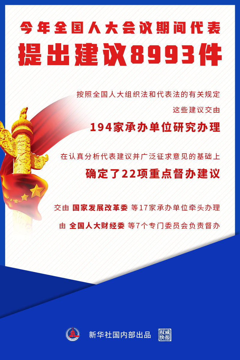 记者6日从在京召开的十三届全国人大四次会议代表建议交办会上获悉,今年全国人大会议期间代表共提出建议8993件。按照全国人大组织法和代表法的有关规定,这些建议交由194家承办单位研究办理。在认真分析代表建议并广泛征求意见的基础上,全国人大常委会办公厅确定了22项重点督办建议,涉及代表建议300多件,交由国家发展改革委等17家承办单位牵头办理,由全国人大财经委等7个专门委员会负责督办。