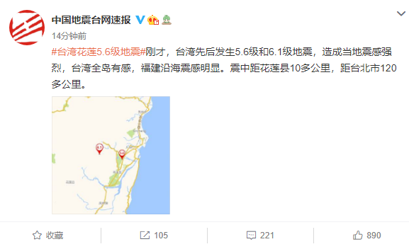 刚才,台湾先后发生5.6级和6.1级地震,造成当地震感强烈,台湾全岛有感,福建沿海震感明显。震中距花莲县10多公里,距台北市120多公里。 中国地震台网正式测定:04月18日22时14分在台湾花莲县(北纬23.94度,东经121.43度)发生6.1级地震,震源深度5千米。 中国地震台网正式测定:04月18日22时11分在台湾花莲县(北纬23.92度,东经121.53度)发生5.6级地震,震源深度7千米。 责任编辑:岳文燕 0