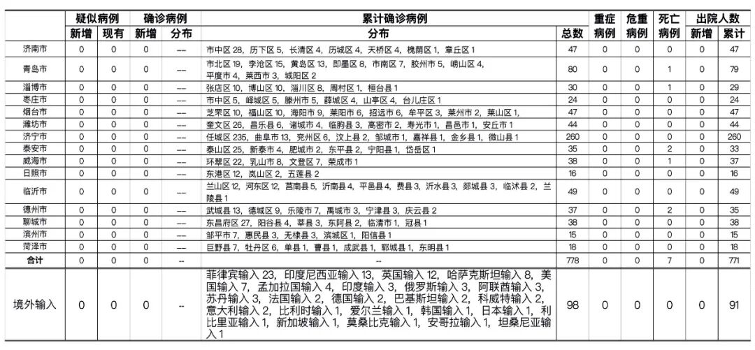 山东无新增本地疑似病例、确诊病例。累计报告确诊病例778例,死亡7例,治愈出院771例。