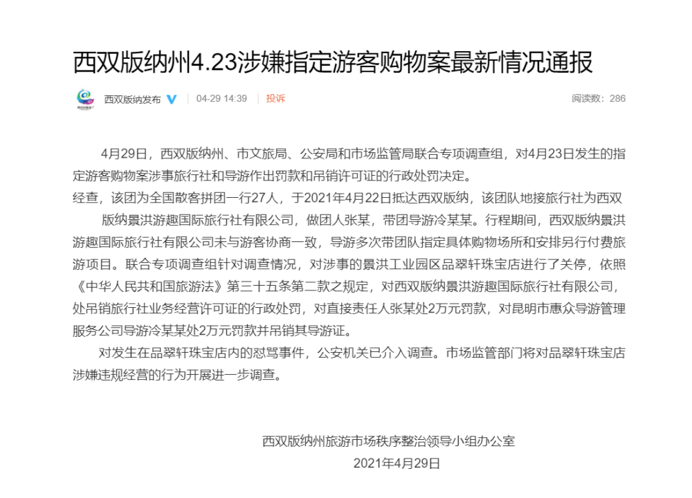 4月29日,西双版纳州、市文旅局、公安局和市场监管局联合专项调查组,对4月23日发生的指定游客购物案涉事旅行社和导游作出罚款和吊销许可证的行政处罚决定。