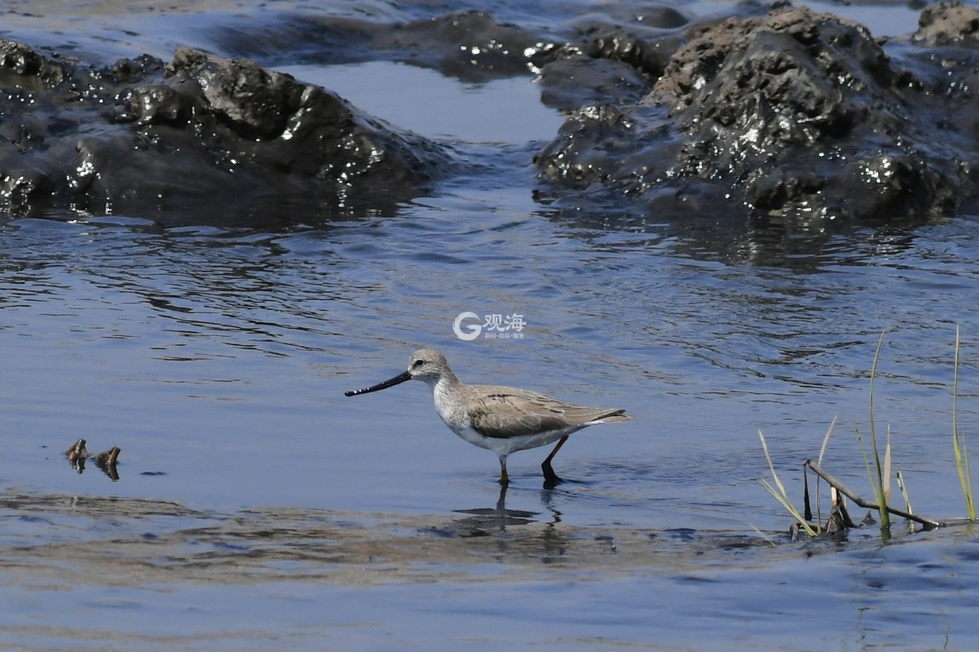 - 一只翘嘴鹬在水中觅食。观海摄影师 王海滨 摄