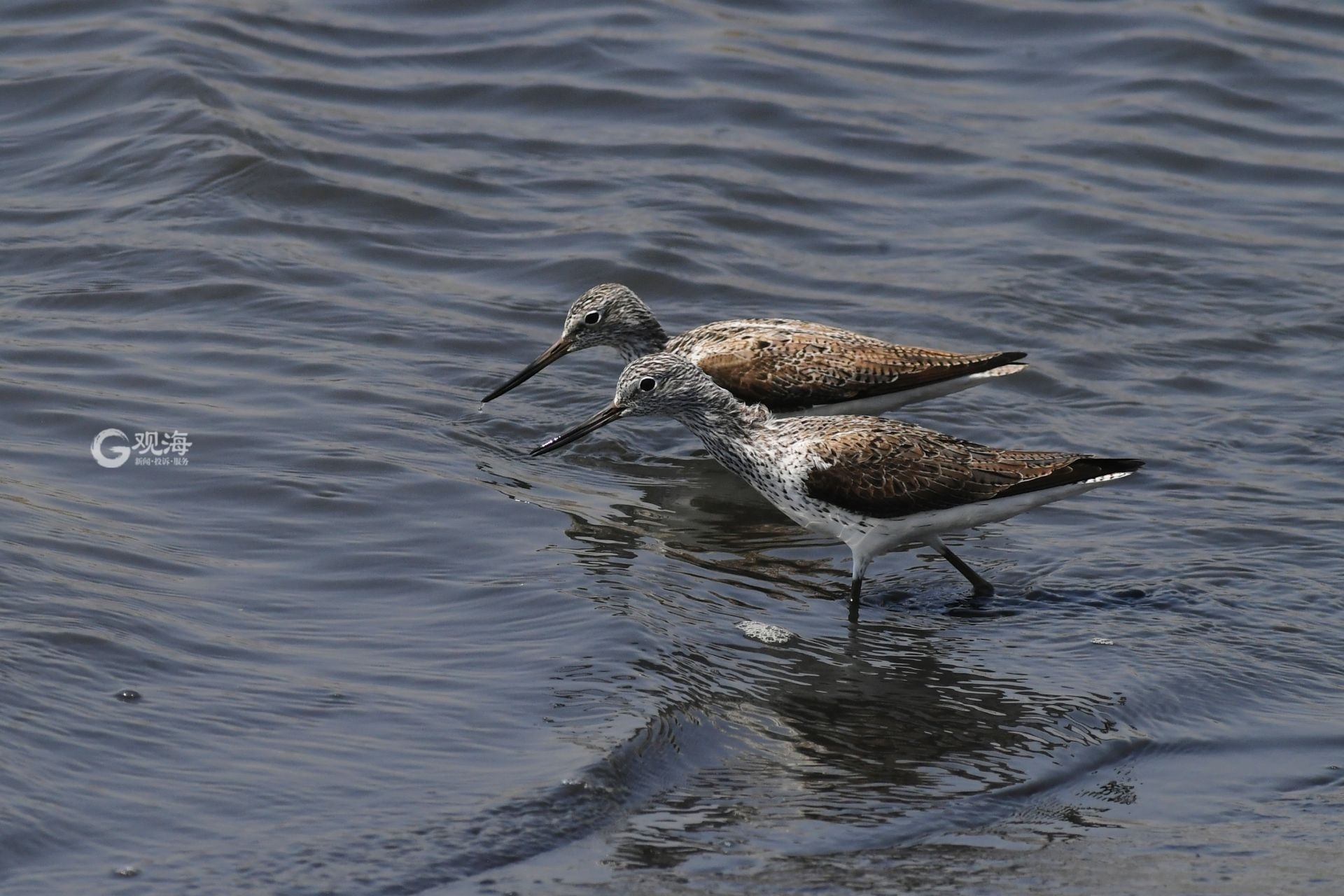 - 两只青脚鹬在青岛城阳墨水河入海口湿地觅食。观海摄影师 王海滨 摄