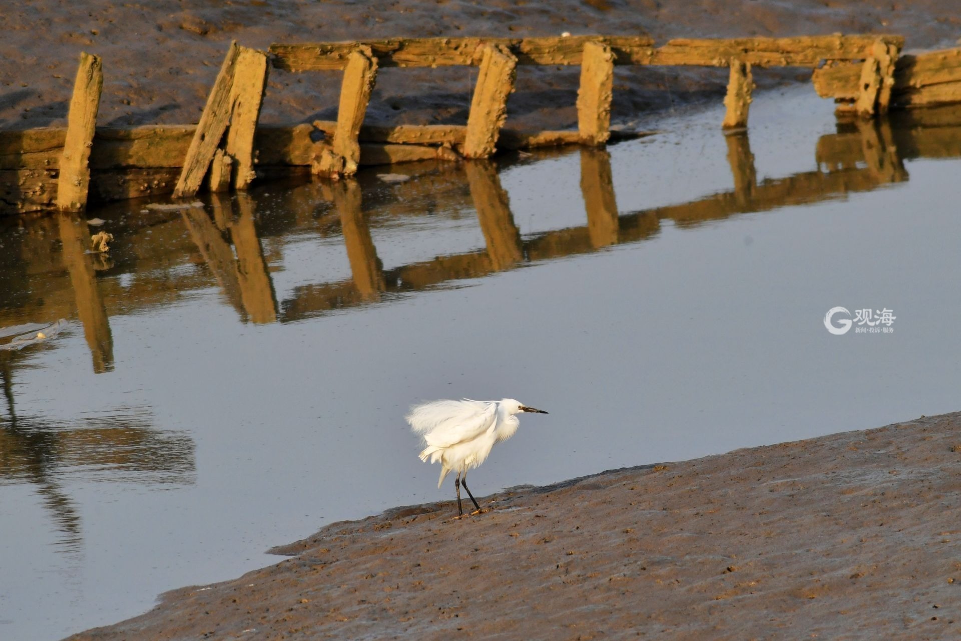 - 一只小白鹭在青岛城阳墨水河入海口湿地抖动漂亮的繁殖羽。观海摄影师 王海滨 摄