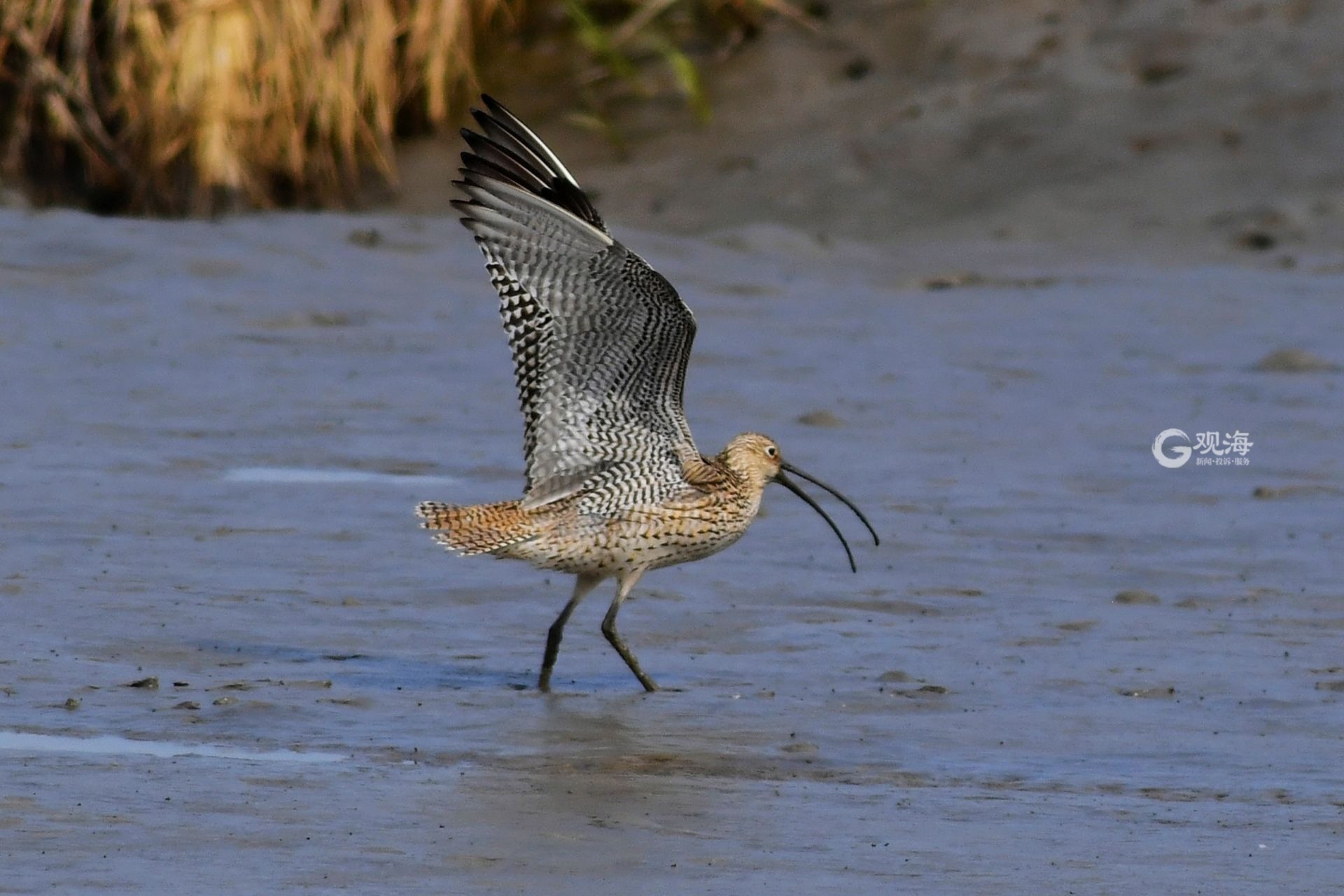 - 一只大杓鹬在青岛城阳墨水河入海口湿地觅食。观海摄影师 王海滨 摄