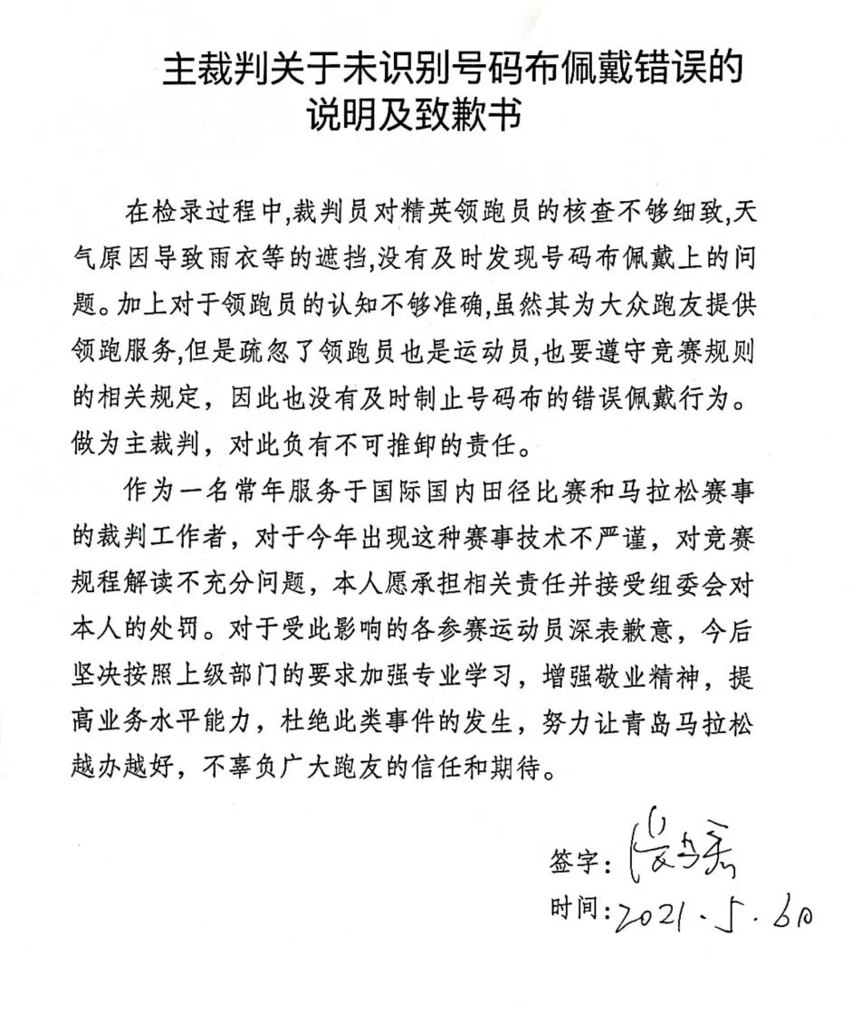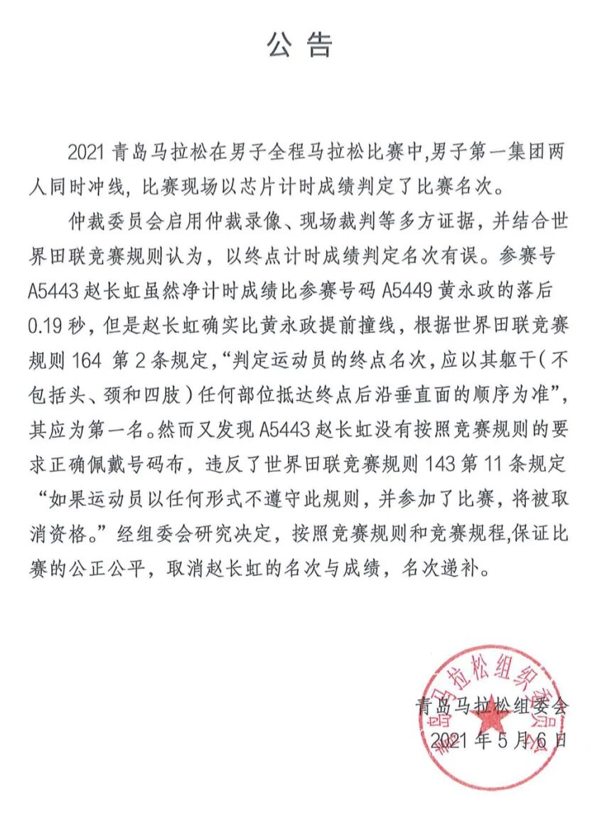 青岛马拉松组委会发布公告:男子马拉松亚军被取消成绩