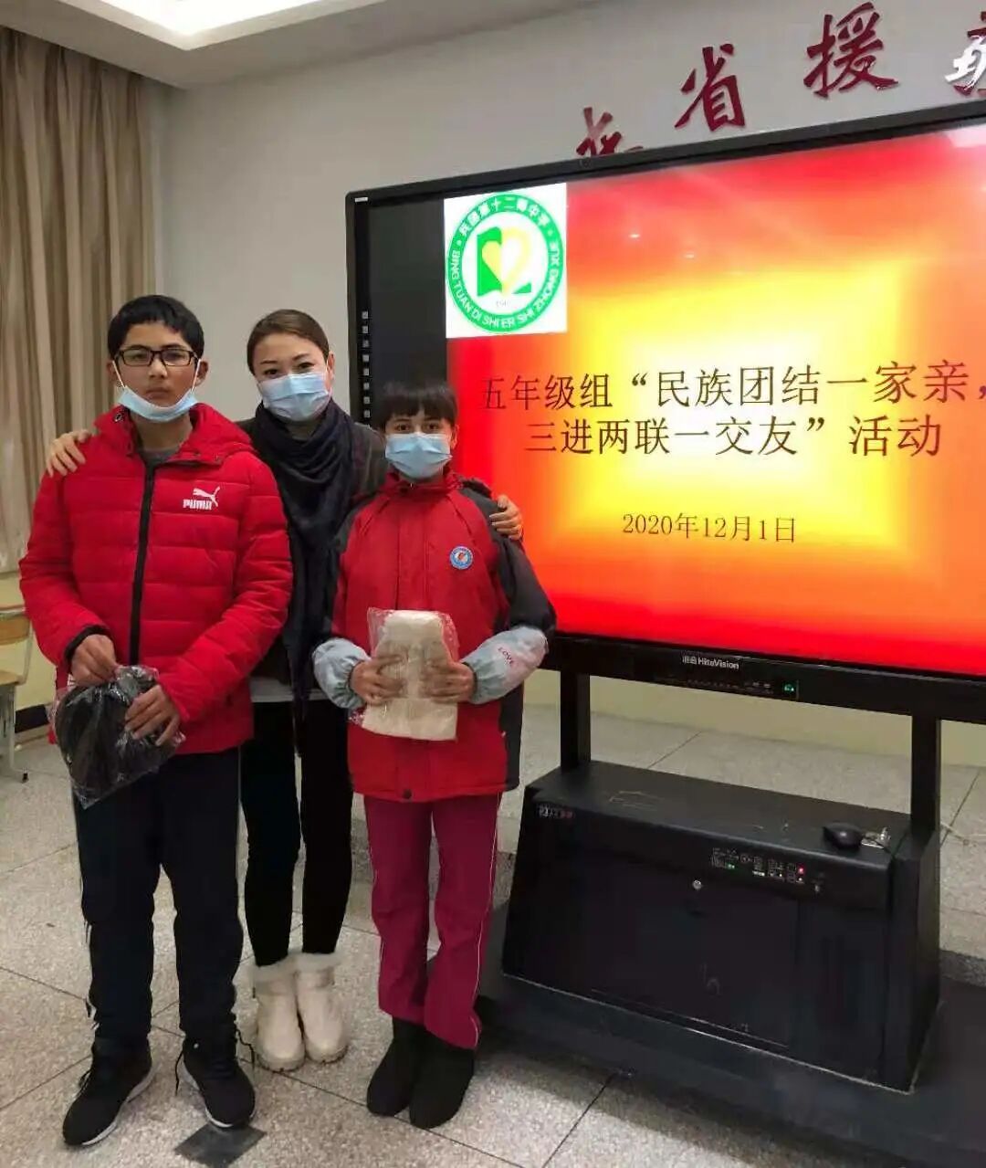 姜琳在学校民族团结“三进两联一交友”活动中,同当地教师一样,与努尔萨古丽和伊斯坎代尔两名维吾尔族少年正式“结亲”。和两个孩子沟通,了解生活上的困难,解决学习上的困惑,成了姜琳每周都要做的事。入冬后,姜琳还多次自费给两个孩子购买御寒生活用品,在她看来,孩子需要的不仅仅是学习上的辅导,更需要生活中的关爱。