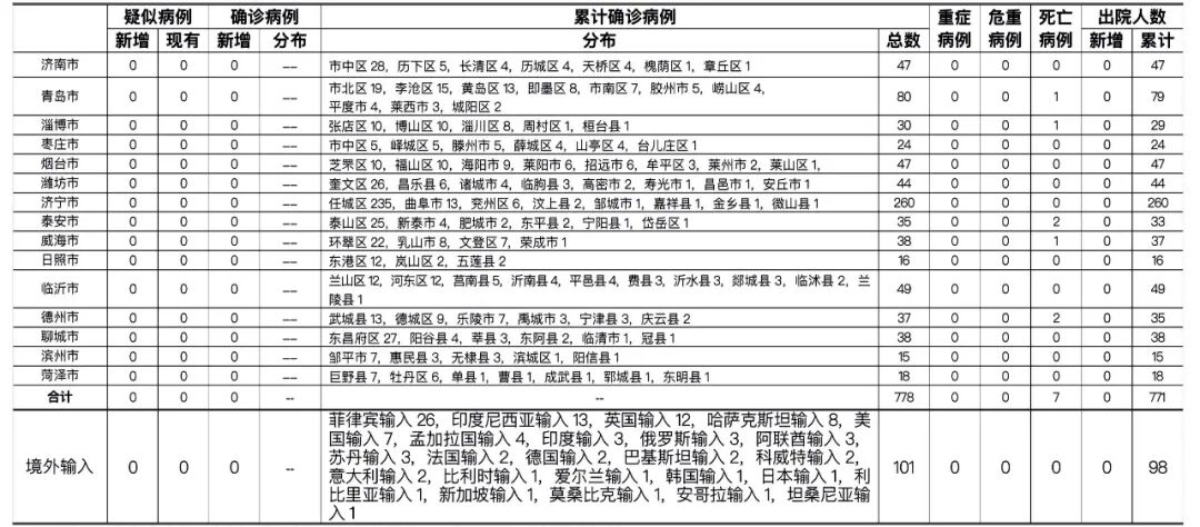 山东无新增本地疑似病例、确诊病例。累计报告确诊病例778例,死亡7例,治愈出院771例。