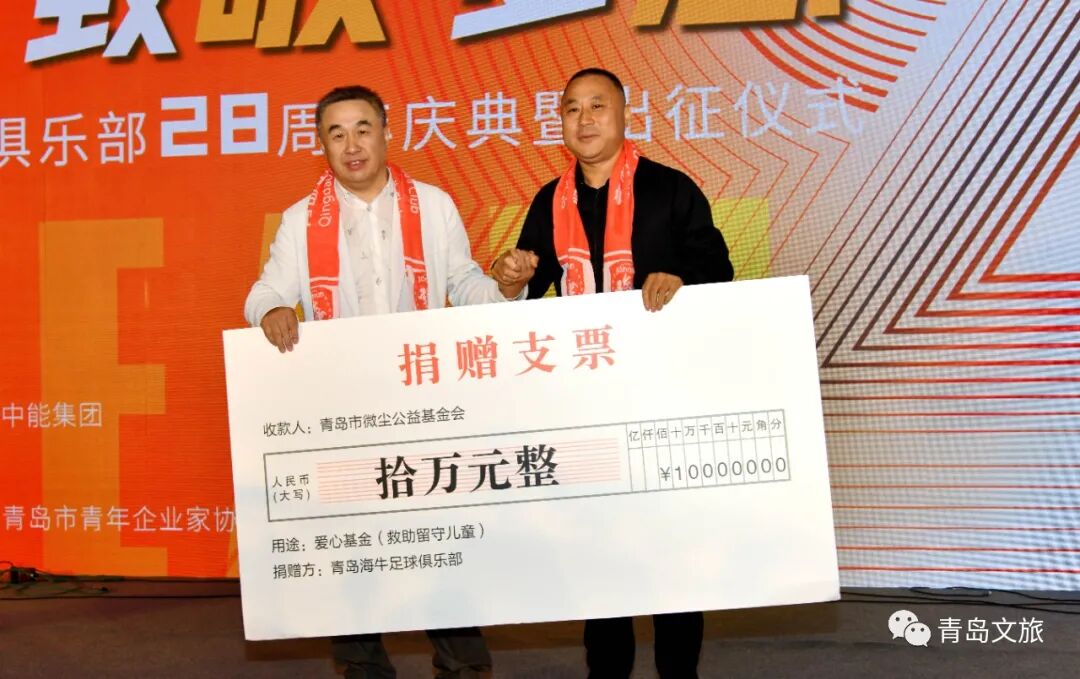 在扎实做好俱乐部建设同时,海牛还不忘投身公益事业的初心。按计划,每一名俱乐部职业球员确保每年不少于50小时的足球公益活动。除此之外,俱乐部及中能集团还通过一系列实实在在的投入做公益、献爱心。在10日晚活动期间,海牛俱乐部老板乔伟光将10万元爱心捐款支票递给了青岛市微尘公益基金会理事长于海波。