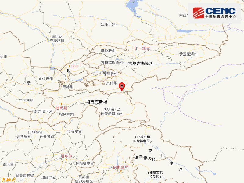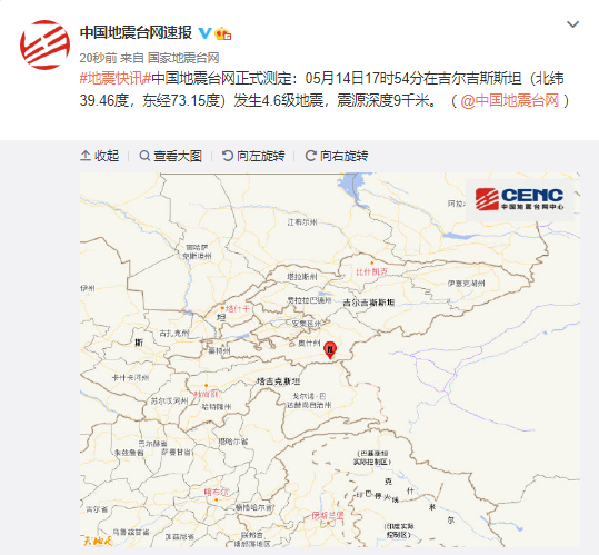 中国地震台网正式测定:05月14日17时54分在吉尔吉斯斯坦(北纬39.46度,东经73.15度)发生4.6级地震,震源深度9千米。