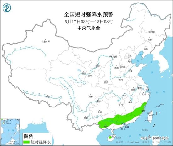 预计5月17日08时至18日08时,福建东南部、广西东部和西南部、广东中北部、云南东南部等地的部分地区将有8-10级雷暴大风或冰雹天气;湖南南部、江西南部、浙江南部、福建、广西东部和西南部、广东中北部等地的部分地区将有短时强降水天气,小时雨强30-50毫米,局地可达60毫米以上。