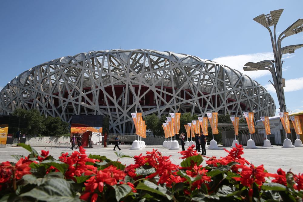 图为9月3日,人们从位于北京奥林匹克公园中轴景观大道的服贸会专题展区走过。(新华社记者潘思危摄)