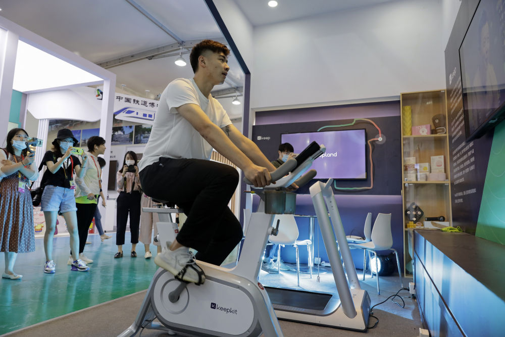 图为9月3日,一名记者在2020服贸会文化体育融合展区体验智能健身设备。(新华社记者李木子摄)
