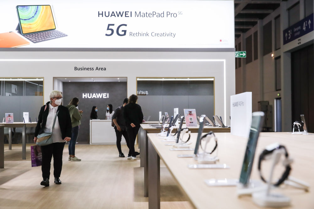 9月3日,在德国首都柏林,参观者在华为公司展区观看展出的电子产品。(新华社记者单宇琦摄)