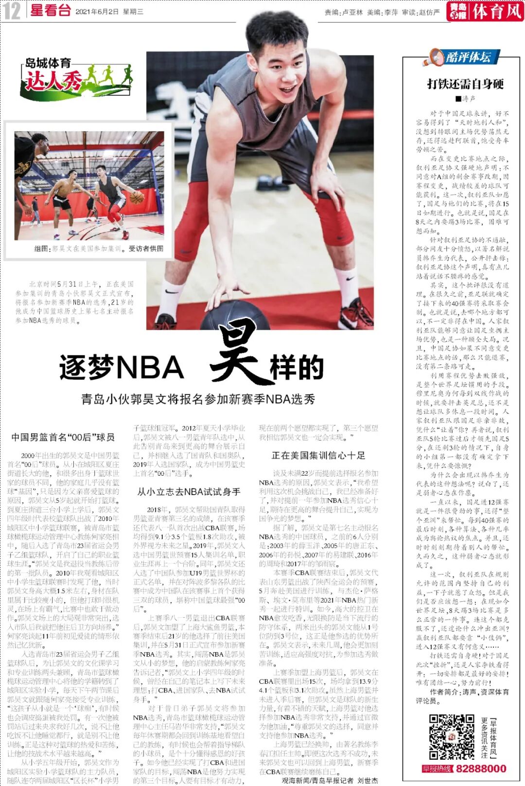 北京时间5月31日上午,正在美国参加集训的青岛小伙郭昊文正式宣布,将报名参加新赛季NBA的选秀,21岁的他成为中国篮球历史上第七名主动报名参加NBA选秀的球员。