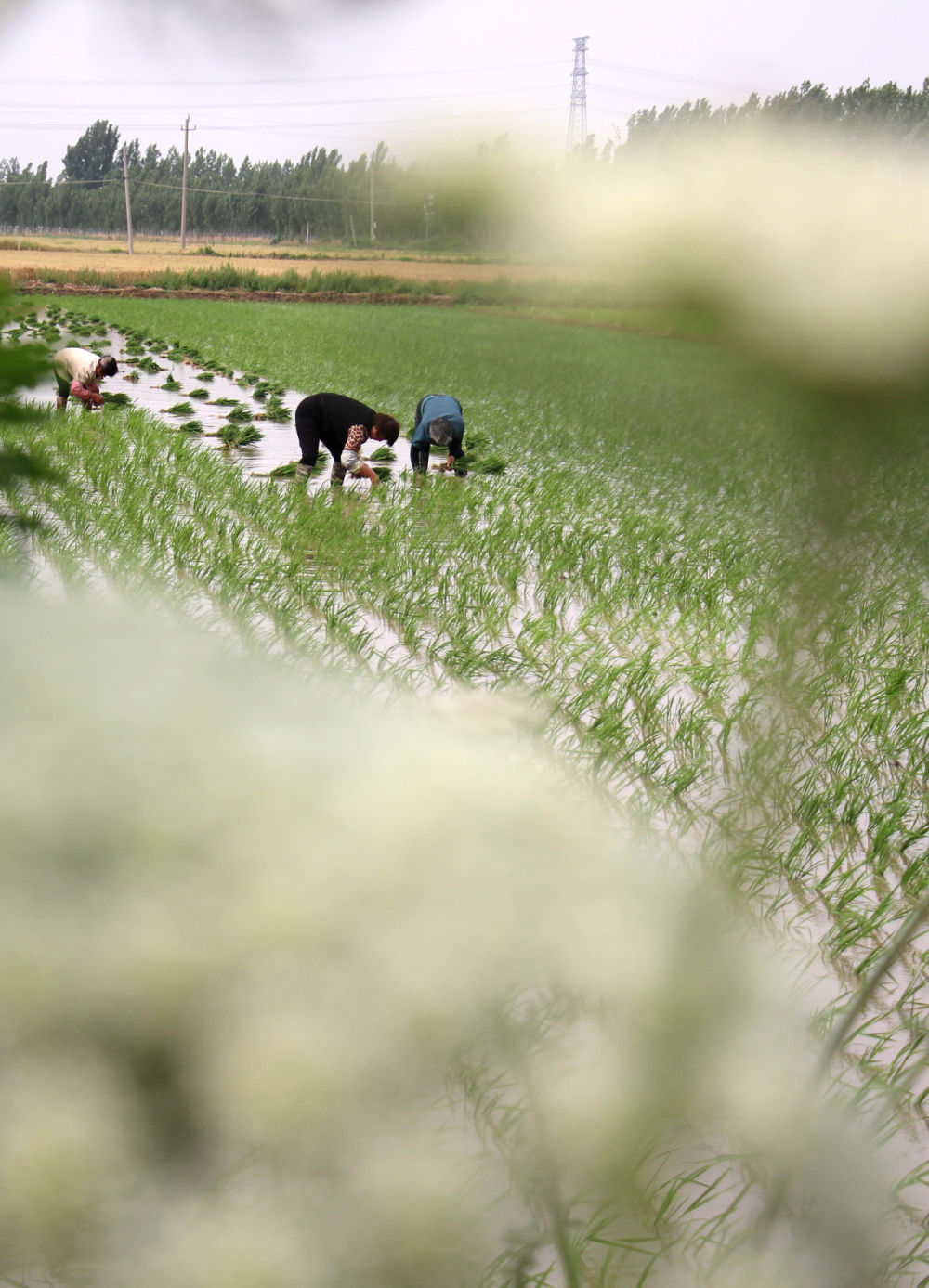 在山东省滨州市高新区青田街道办事处的稻田里,农民在插秧。新华社发(初宝瑞 摄)