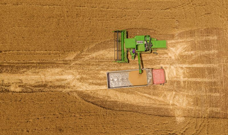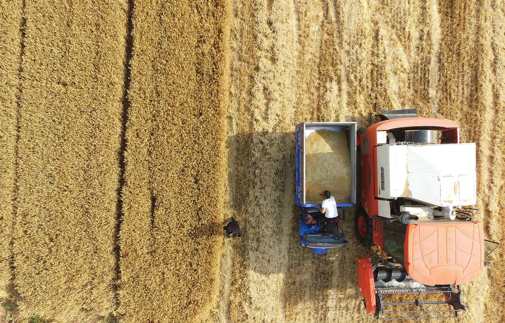 河北省邯郸市磁县讲武城镇八里冢村村民在收获小麦(无人机照片)。新华社发