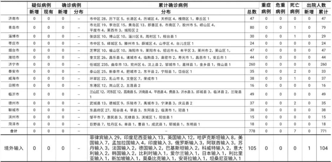 山东无新增本地疑似病例、确诊病例。累计报告确诊病例778例,死亡7例,治愈出院771例。