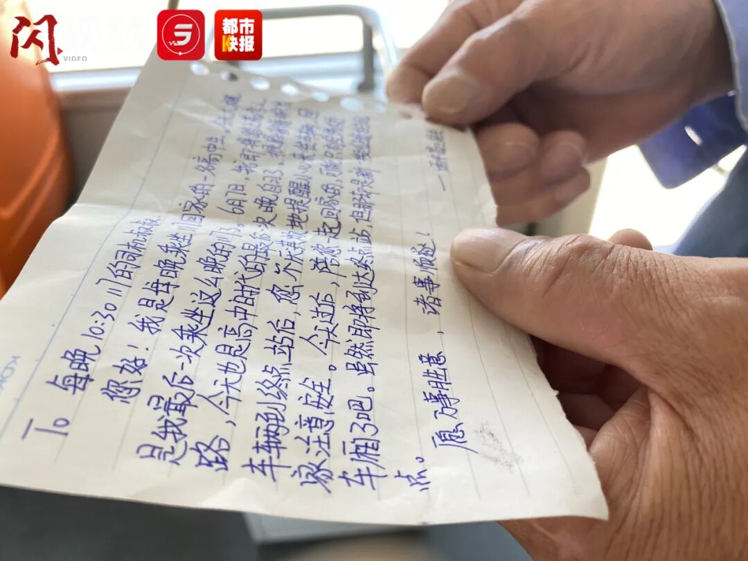 女孩在字条里感谢了陈师傅每晚对她的照顾,并动情地写道,“今天过后,陪您一起回家的可能只有空荡的车厢了吧,虽然即将到达终点站,但那却是新一段征途的起点。愿万事胜意,诸事顺遂。”