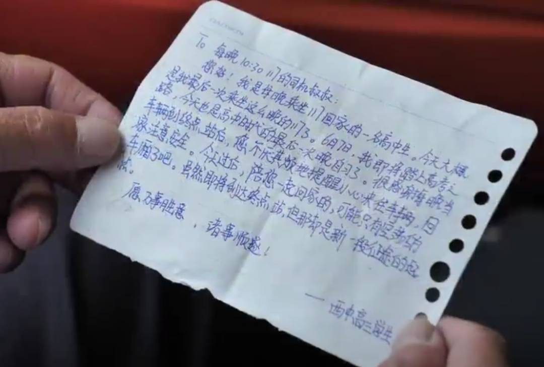 “我开到停车场,进行例行检查时在座位上发现一个字条一看内容,是个高三学生留下的。”陈师傅说。