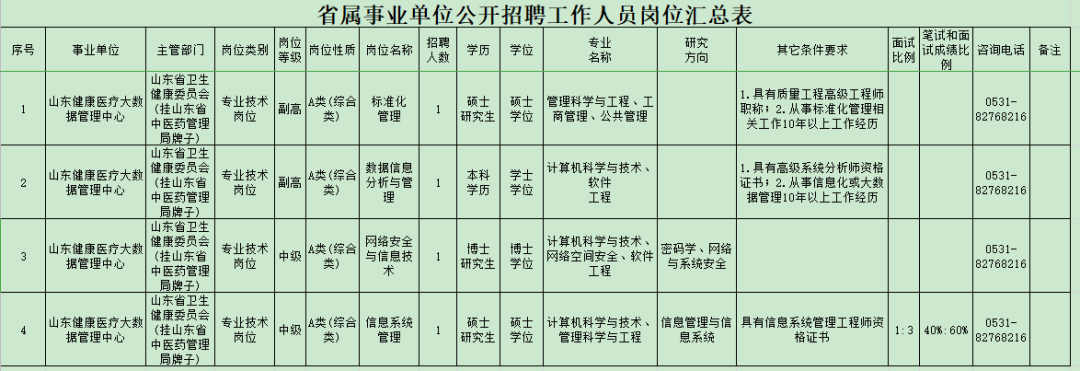 山东健康医疗大数据管理中心2021年公开招聘工作人员 招聘岗位和人数:拟面向社会公开招聘中高级专业技术岗位工作人员4人,其中高级岗位2人,中级岗位2人。 点击链接查看: 山东健康医疗大数据管理中心2021年公开招聘工作人员简章 聊城大学2021年公开招聘工作人员 招聘岗位和人数:拟面向社会公开招聘初级专业技术岗位工作人员40名。 点击链接查看: 聊城大学2021年公开招聘工作人员简章 滨州学院2021年公开招聘工作人员 招聘岗位和人数:拟面向社会公开招聘初级专业技术岗位(以下简称“初级岗位”)工作人员9名。 点击链接查看: 滨州学院2021年公开招聘工作人员简章 责任编辑:王凤一 0
