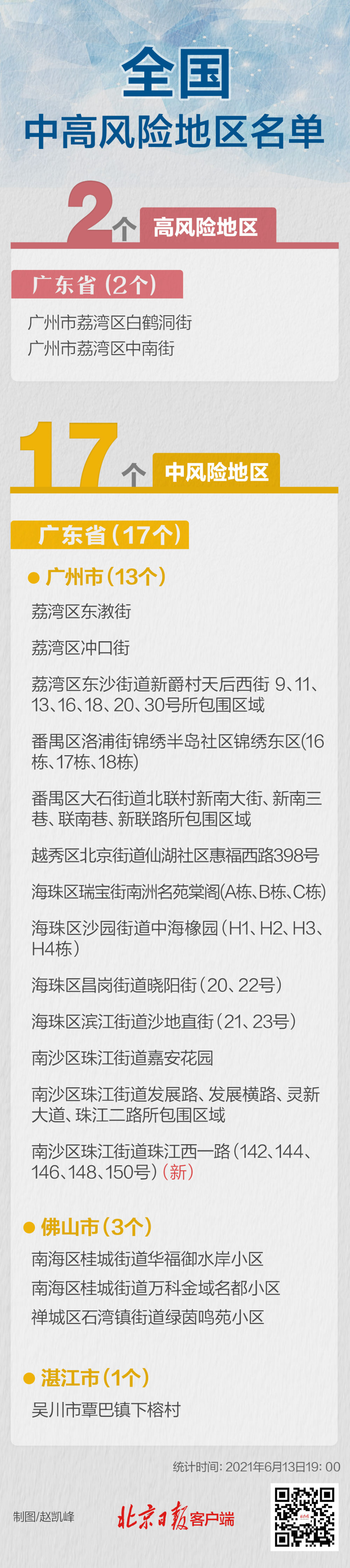 经广州市新冠肺炎防控指挥部同意,自2021年6月13日起,广州市南沙区珠江街道珠江西一路(142、144、146、148、150号)由低风险地区调整为中风险地区。