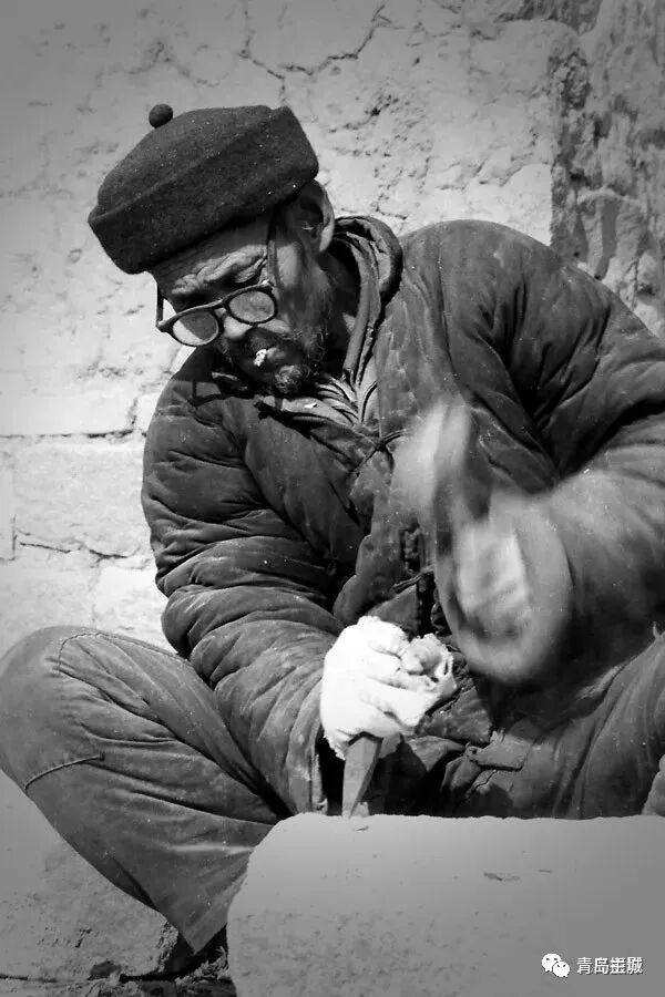 △1983年胶南海青公社后坡娄大队的石匠正在凿石,准备盖新房。(王群 摄)